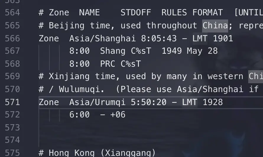 下载了时区数据文件,看见一个叫asia的文件,果断打开,然后找到了中国相关的时区: