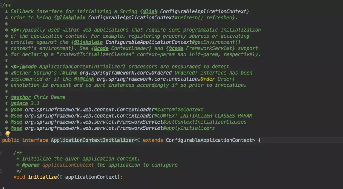 通常被用作web应用,在一些程序设计在spring容器初始化使用。比如说注册一些熟悉配置或者激活一些配置文件针对(ConfigurableApplicationContext的getEnvironment()方法)。参考ContextLoader和FrameworkServlet支持定义一个"contextInitializerClasses"上下文参数或者初始化参数。