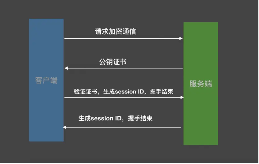 客户端向服务端索要公钥并验证 双方协商生成回话秘钥(session Id) 通过会话密钥进行通信