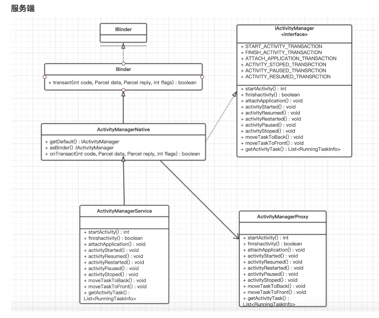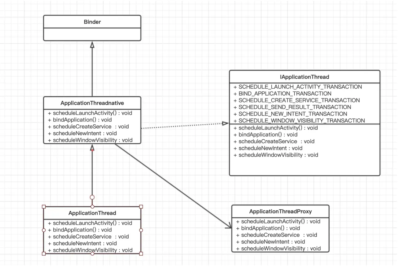 IApplicatonThread是调度的接口,ApplicationThread是具体的实现类,运行在应用进程,ApplicationThreadProxy是ApplicationThread在AMS进程的一个代理类,AMS就是通过它调用ApplicationThread的方法,ApplicationThreadNative是一个中间件,AMS通过它得到ApplicationThreadProxy对象。