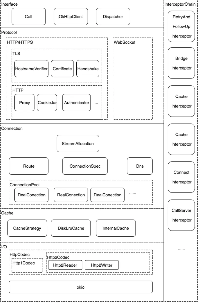 自定义interceptor开发者自定义,可以对request和respons做各种定制操作``RetryAndFollowUpInterceptor重试和重定向,创建StreamAllocation,添加到chain中``BriageInterceptor桥接应用层和实际网络层,即把应用层request包装成网络可用的request,把网络返回的Response包装成应用层可用的ResponseCacheInterceptor缓存控制,使用缓存策略决定使用缓存还是重新请求网络ConnectInterceptor使用socket建立Socket连接,如果是https请求还是建立TLS连接自定义NetworkInterceptor开发者自定义,主要是做网络调试时使用CallServerInterceptor跟服务器做数据调用,发送并接受数据