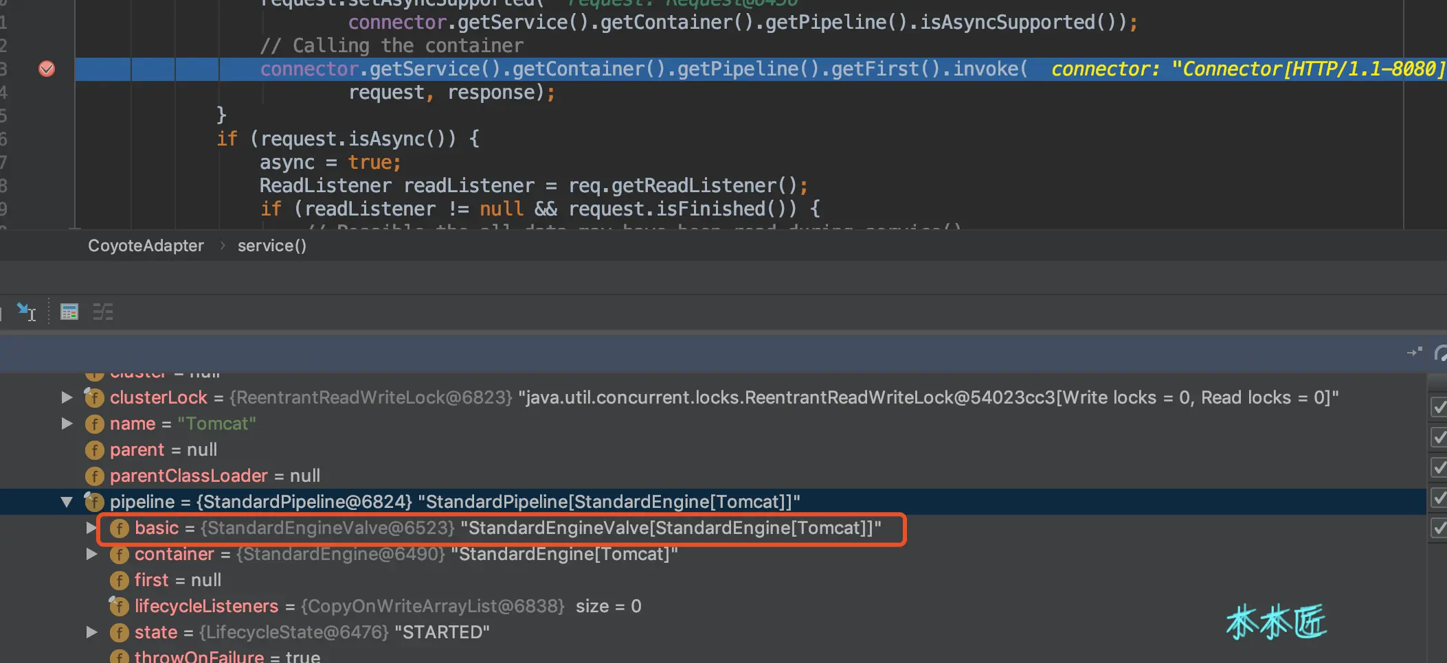 根据如上代码,我们知道了basic是一个管道(Pipeline)中的最后一个阀门,按道理只要最后一个阀门是下一个容器的第一个阀门就可以完成全部的链式调用了。我们用一个请求debug下看看是不是和我们的猜测一样,我们在CoyoteAdapter中的service方法中打个断点,效果如下: