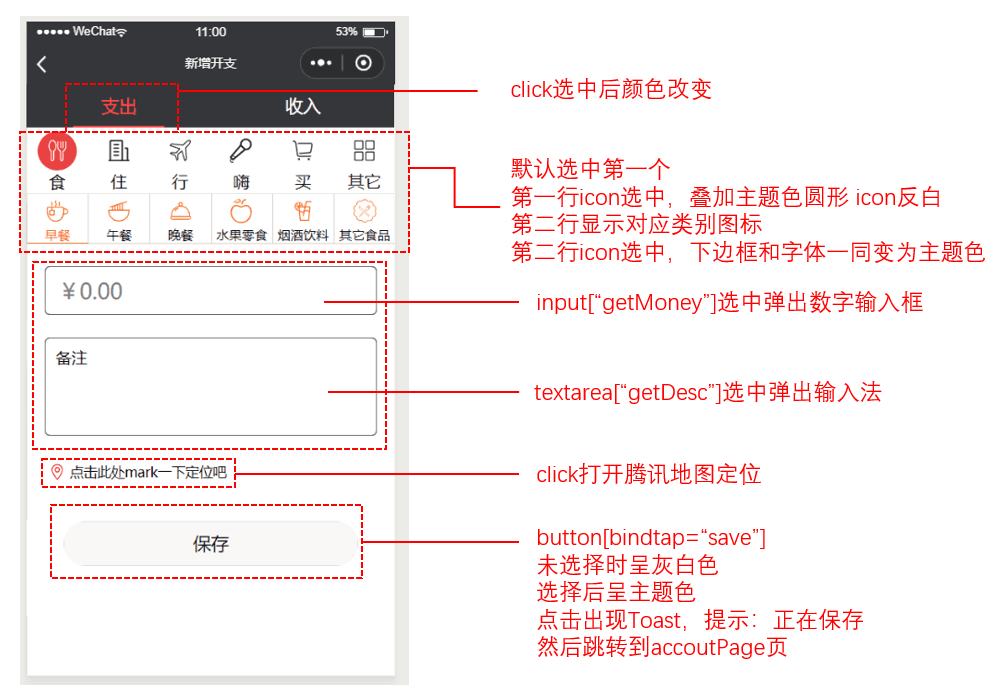 因为收入与支出页面基本类似,所以使用自定义组件封装,可以复用: