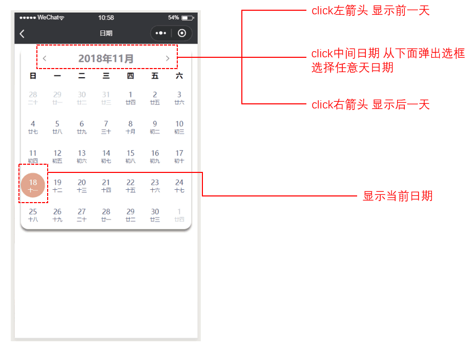 <calendar weeks-type="cn" cell-size="50" next="{{true}}" prev="{{true}}"