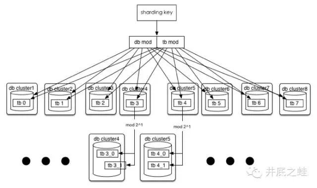 如果32个集群也无法满足需求,那么将分库分表规则调整为(32*2^n)*(32/2^n),可以达到最多1024个集群。