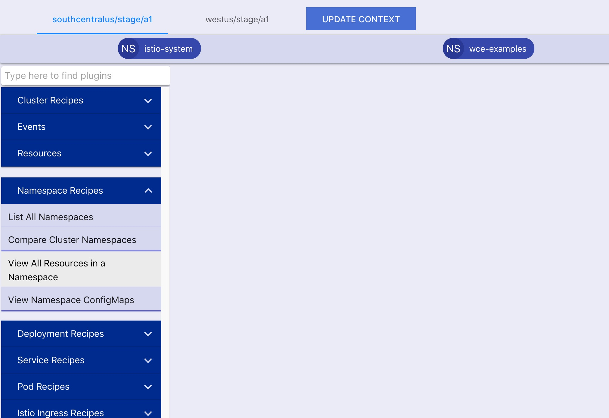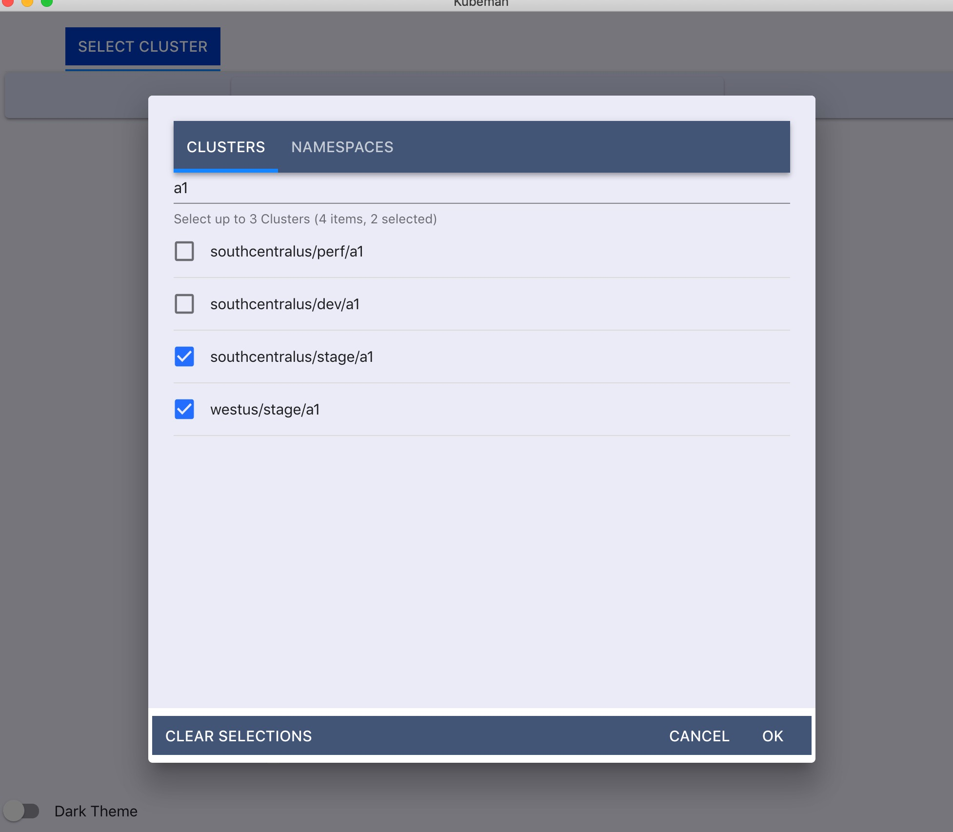 2、点击 Select Cluster 菜单选择集群,还可以在 NAMESPACES 对话框中选择一个或多个 namespace,将后面操作项的会话限制在某些 namespace 中。