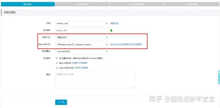 接下来我们输入【基本信息】。选择安全认证:阿里云 APP;AppCode 认证可以选择:允许 AppCode 认证(Header & Query)。具体 AppCode 认证方式可以参考:使用简单认证(AppCode)方式调用 API。