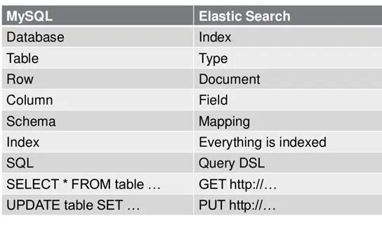 - MySQL 中一个数据库表(Table)下的数据由多行(Row)多列(column,属性)组成,等价于1个 Type 由多个文档(Document)和多 Field 组成。