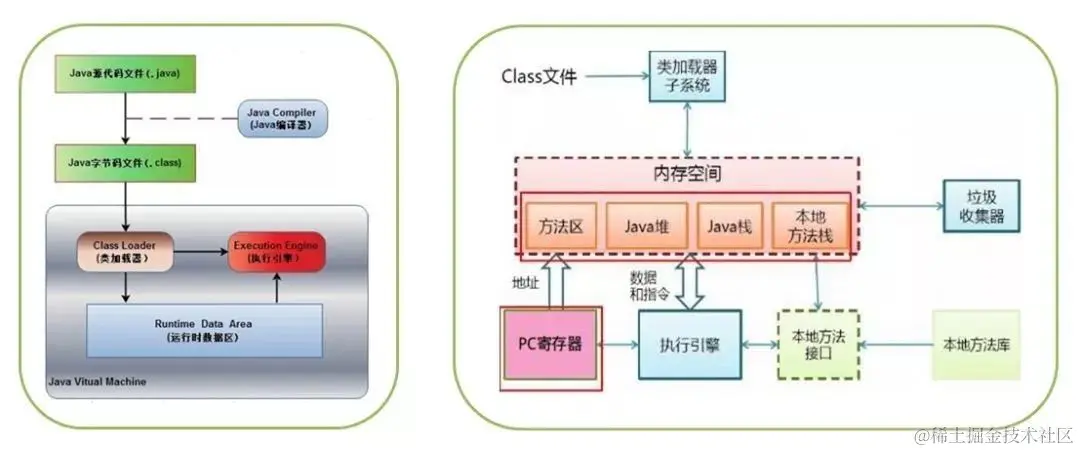 Java编译器将源码(.java)编译成字节码,由类加载器加载到jvm中后,进行分析校验,最后由执行引擎执行。