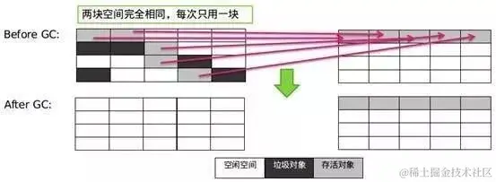 把内存空间划为两个相等的区域,每次只使用其中一个区域。GC 时遍历当前使用区域,把正在使用中的对象复制到另外一个区域中。