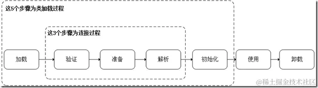 类加载的生命周期:加载(Loading)-->验证(Verification)-->准备(Preparation)-->解析(Resolution)-->初始化(Initialization)-->使用(Using)-->卸载(Unloading)