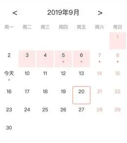 切换月份, 当天文案为今天, 日期背景变色, 日期红点标识, 点击选中日期.