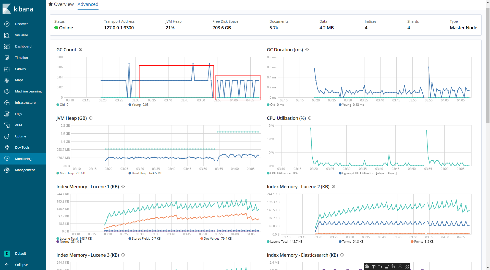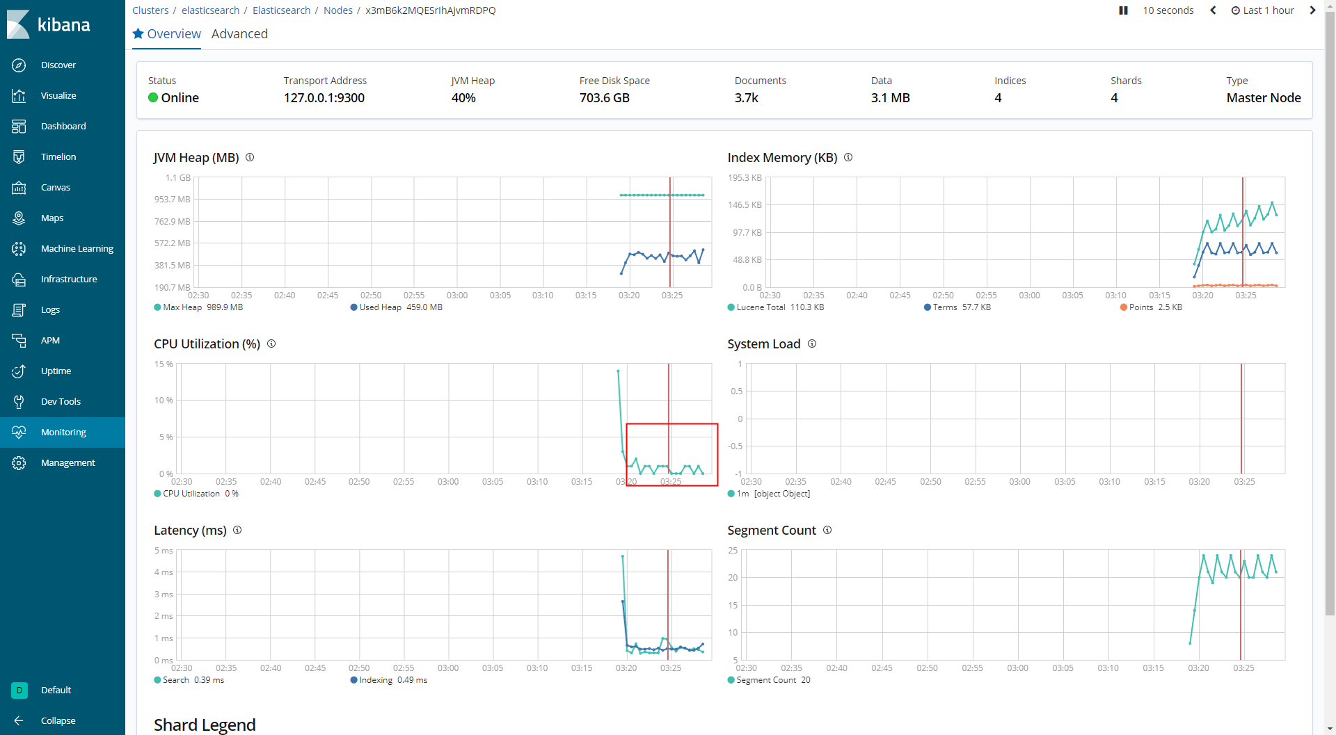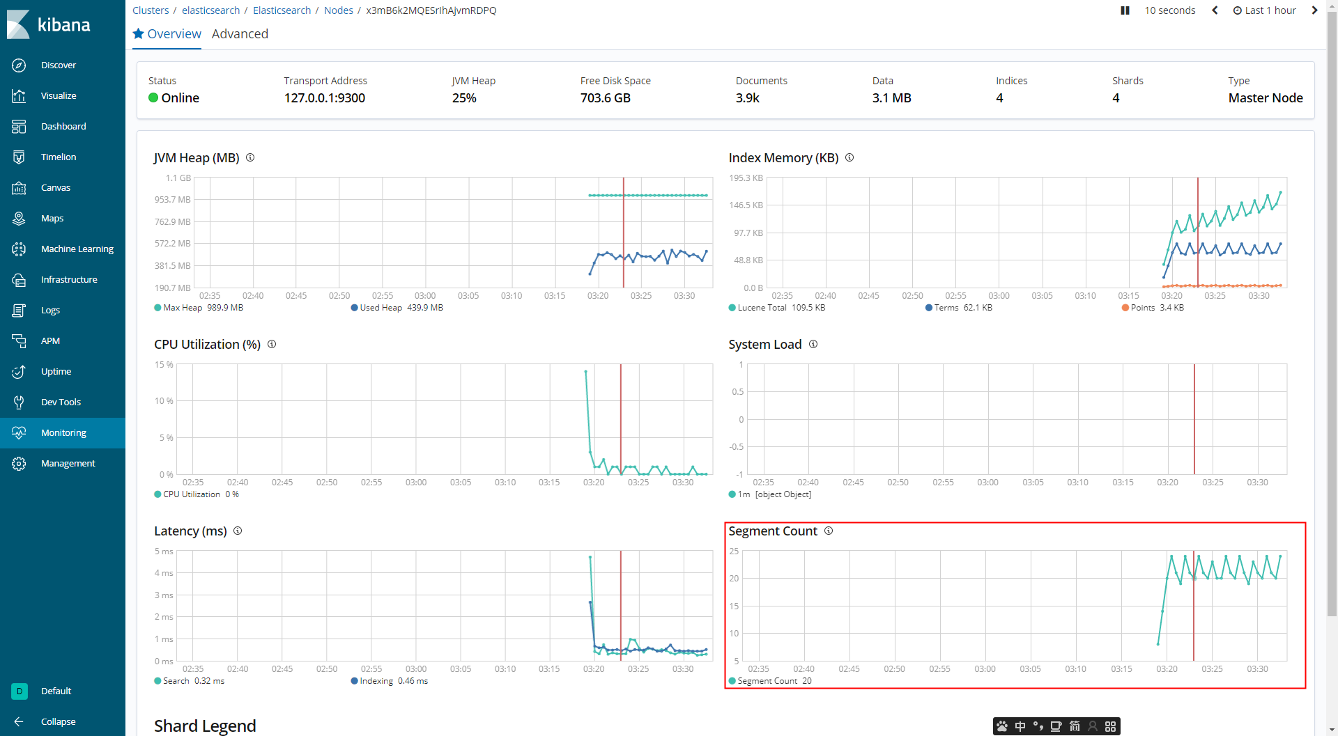 Segment Count目前在20左右。考虑到存在用于监控ElasticSearch的4个索引,每个索引含有的1个分片。所以,总共有4个分片。