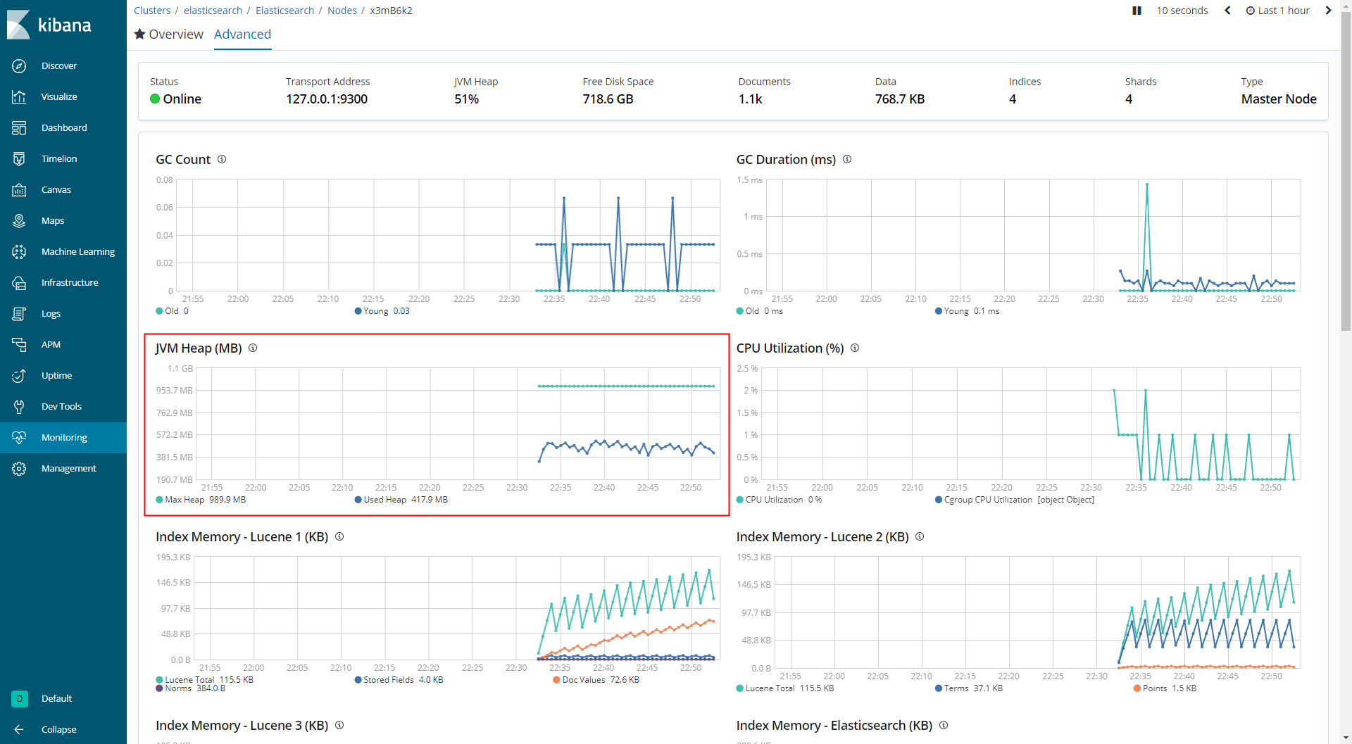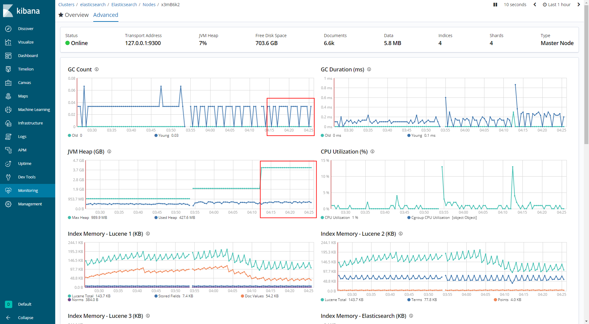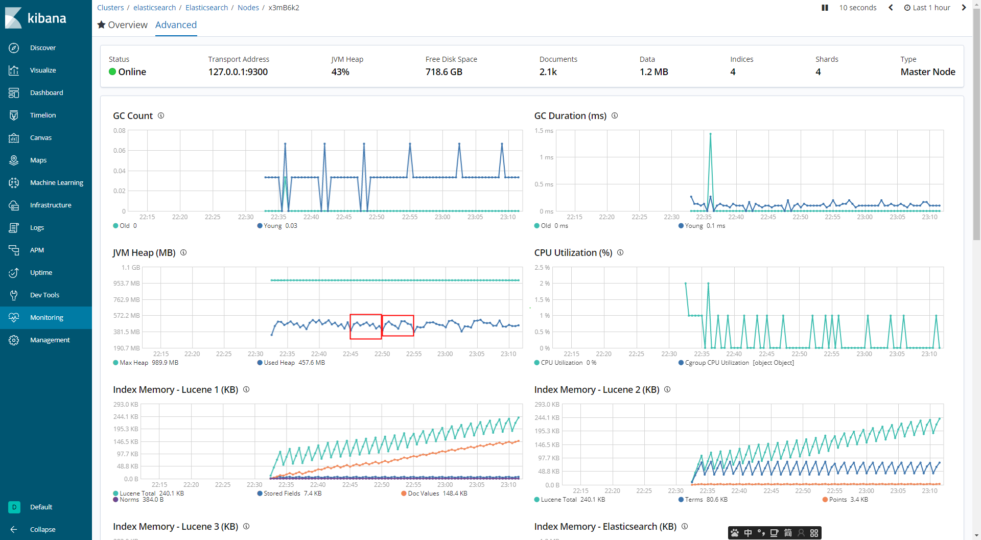 但是,观察下图,会发现在5分钟内折线向下的只有大概6次左右。不是说每个20次左右会发生一次Young GC,折线向下的应该会更加密集才对啊。其实这里是因为图像采集的频率是不一样的。所以,导致这里的折线和预估的有差距。估计Kibana应该是10s采集一次JVM内存信息。因为我数了一下1min内,存在大概6,7个点。不过,目前来看修改上面的refresh时间好像不能改变Kibana的采集频率。