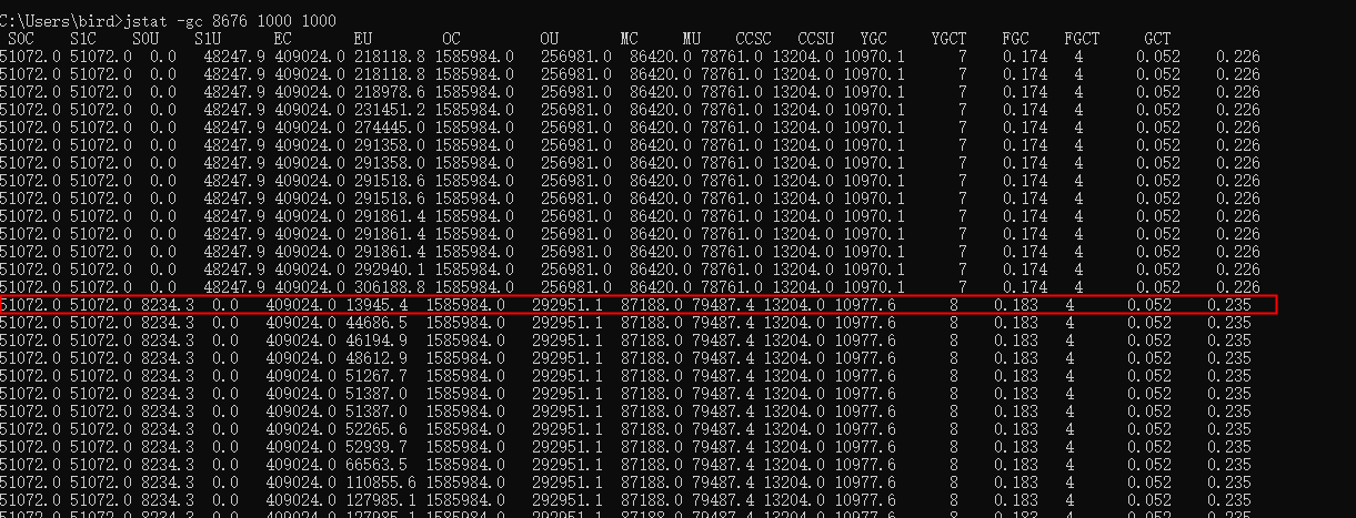 通过jstat,我们可以发现当前Eden区占用了273MB,每隔1秒钟会增加10MB多点。所以,我们可以估算大概20次左右就会触发一次Young GC,回收掉Eden区的内存。