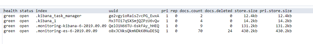 可以看到使用Kibana对ElasticSearch进行监控的时候,存在4个索引。每个索引存在一个主分片,没有副本。总小大不超过1M。