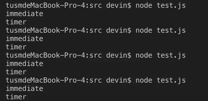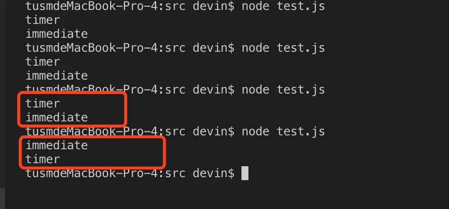 而我们在执行代码的时候,进入timers的时间延迟其实是随机的,并不是确定的,所以会出现两个函数执行顺序随机的情况。