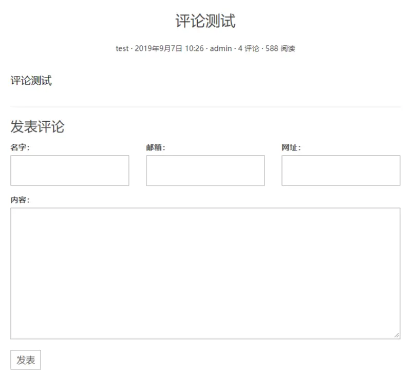 可以测试一下提交评论的功能了,首先尝试输入非法格式的数据,例如将邮箱输入为 xxx@xxx,那么评论视图在校验表单数据合法性时,发现邮箱格式不符,就会渲染 preview 页面,展示表单中的错误,将邮箱修改为正确的格式后,再次点击发表,页面就跳转到了被评论文章的详情页,说明视图正确执行了保存表单数据到数据库的逻辑。