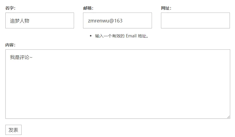 这里还是使用 show_comment_form 模板标签来展示一个表单,然而不同的是,这里我们传入由视图函数 comment 传来的绑定了用户提交的数据的表单实例 form,而不是渲染一个空表单。因为视图函数 comment 中的表单实例是绑定了用户提交的评论数据,以及对数据进行过合法性校验的表单,因此当 django 渲染这个表单时,会连带渲染用户已经填写的表单数据以及数据不合法的错误提示信息,而不是一个空的表单了。例如下图,我们提交的数据中 email 格式不合法,表单校验了数据格式,然后渲染错误提示:
