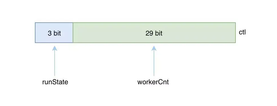 ctl 的高3位用来表示线程池的状态(runState),低29位用来表示工作线程的个数(workerCnt),为什么要用3位来表示线程池的状态呢,原因是线程池一共有5种状态,而2位只能表示出4种情况,所以至少需要3位才能表示得了5种状态。