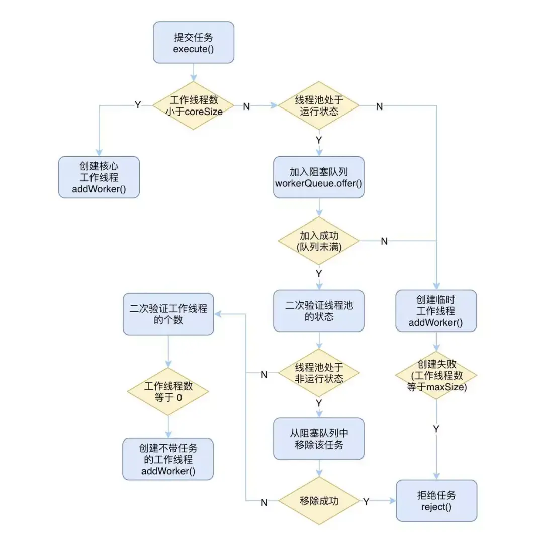 上图是一张线程池工作的精简图,实际的过程比这个要复杂的多,不过这些应该能够完全覆盖到线程池的整个工作流程了。