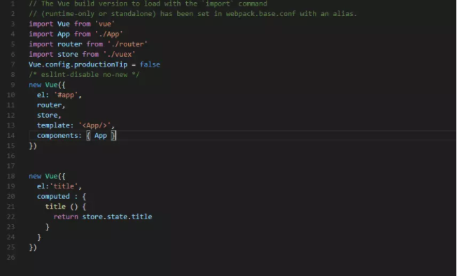 - 那我们在mian.js中再加入new Vue,绑定title作用域的实例代码,