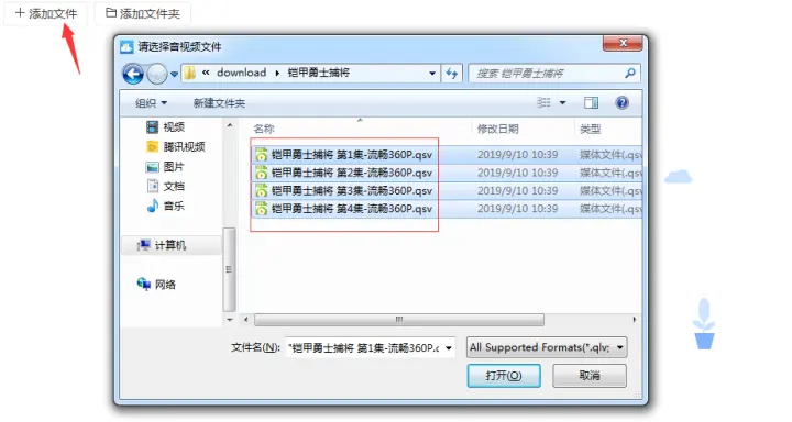 2、调整好功能栏后把你电脑保存好的qsv格式的视频添加到软件中,添加的时候可以点击左上角的添加文件按钮也可以用别的方式添加。