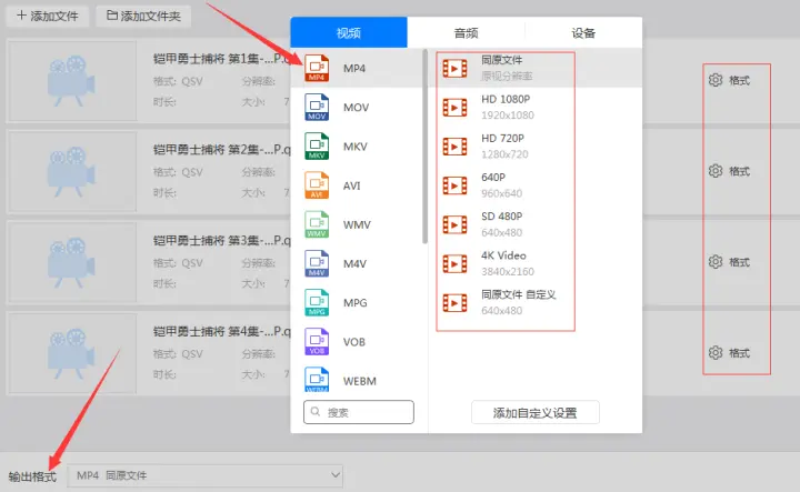 4、点击格式或输出格式按钮把其中输出的视频格式设置为要转换的mp4格式,有需要也可以在输出格式中调整视频输出分辨率。