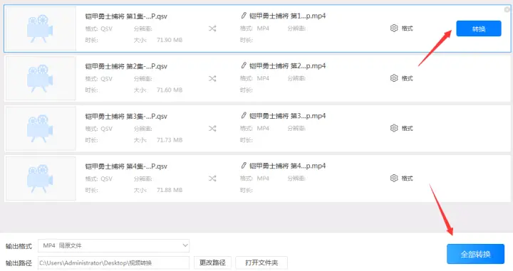 5、最后点击转换或全部转换按钮把你添加到转换器中的qsv格式根据所调整的参数进行转换,转换好后到输出路径就可以找到转换后的视频文件了。