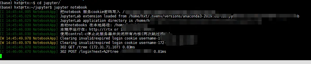 网页打不开jupyter: 我的头像摔跤了 2019-09-10 1,094 阅读1分钟 因为服务器重启了,所以服务器的jupyter服务关闭了,需要在服务器中重新打开jupyter。 切换目录:cd jupyter 启动jupyter:jupyter notebook nohup jupyter notebook --ip 0.0.0.0 --no-browser --allow-root &