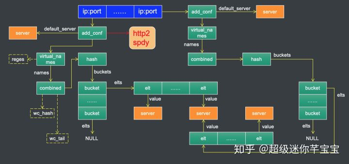 } ngx_http_core_srv_conf_t;这里不细说这些字段是干嘛用的,主要看 ngx_http_core_srv_conf_t 怎么与其他数据结构关联,从上面的配置可以知道 server 是与 IP:Port 有关联的,在 tengine/nginx 里的关系如下: