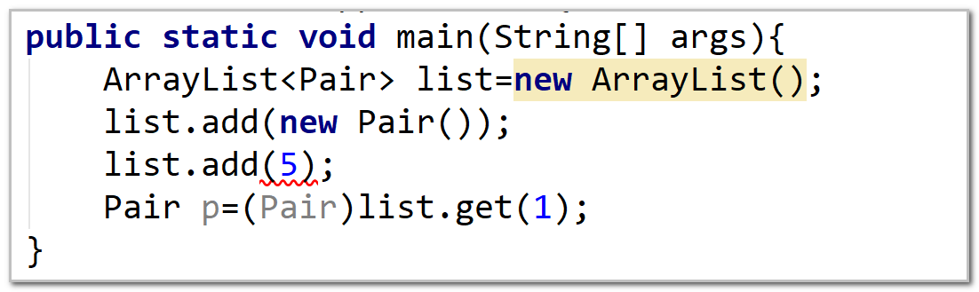 程序将发生java.lang.ClassCastException,很显然,是因为我们把int类型强制转为Pair类型发生的。以上代码是用引入泛型代码之前的方式写的,在引入泛型后,java集合都已经重写以迎合泛型。引入泛型的目的之一就是为了消除这种隐患,于是,泛型的一个原则被引了出来——如果一段代码在编译时没有提出“未经检查的转换”警告,则程序在运行时不会引发ClasscastException异常。
