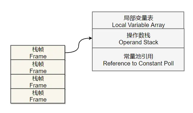 虚拟机栈描述的是Java方法执行的内存模型:每个Java方法在执行的同时会创建一个栈帧(Stack Frame)用于存储局部变量表、操纵数栈、常量池引用、动态链接、方法出口等信息。每一个方法从调用直至执行完成的过程,就对应一个栈帧在虚拟机中入栈到出栈的过程。