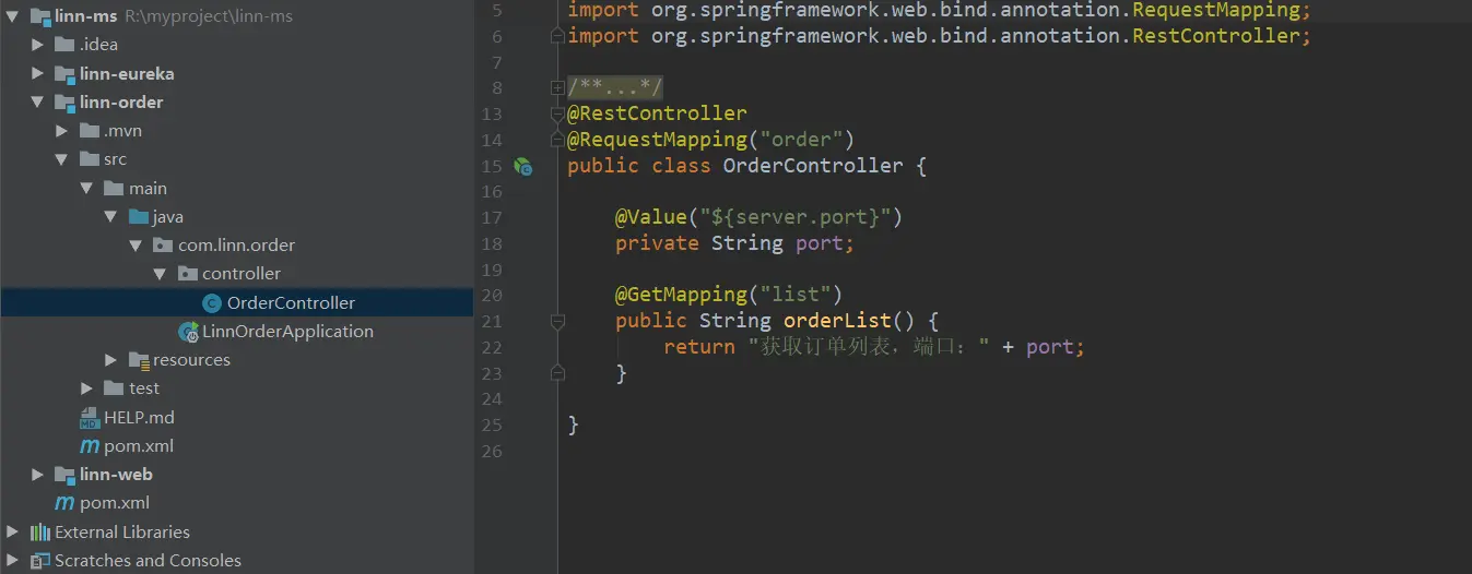 在 之前的order-service项目中 写一个简单的服务,如下,提供一个获取订单服务列表的服务