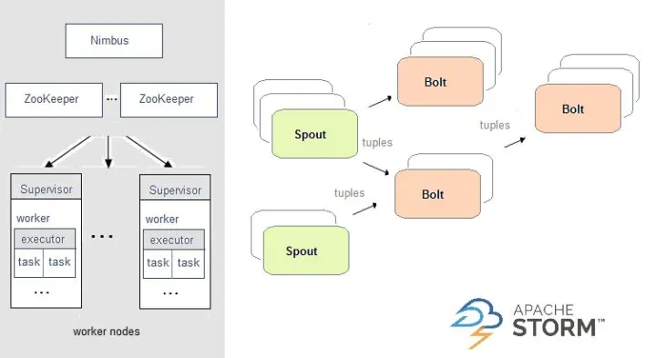在Storm中,需要先设计一个实时计算结构,我们称之为拓扑(topology)。之后,这个拓扑结构会被提交给集群,其中主节点(master node)负责给工作节点(worker node)分配代码,工作节点负责执行代码。在一个拓扑结构中,包含spout和bolt两种角色。数据在spouts之间传递,这些spouts将数据流以tuple元组的形式发送;而bolt则负责转换数据流。