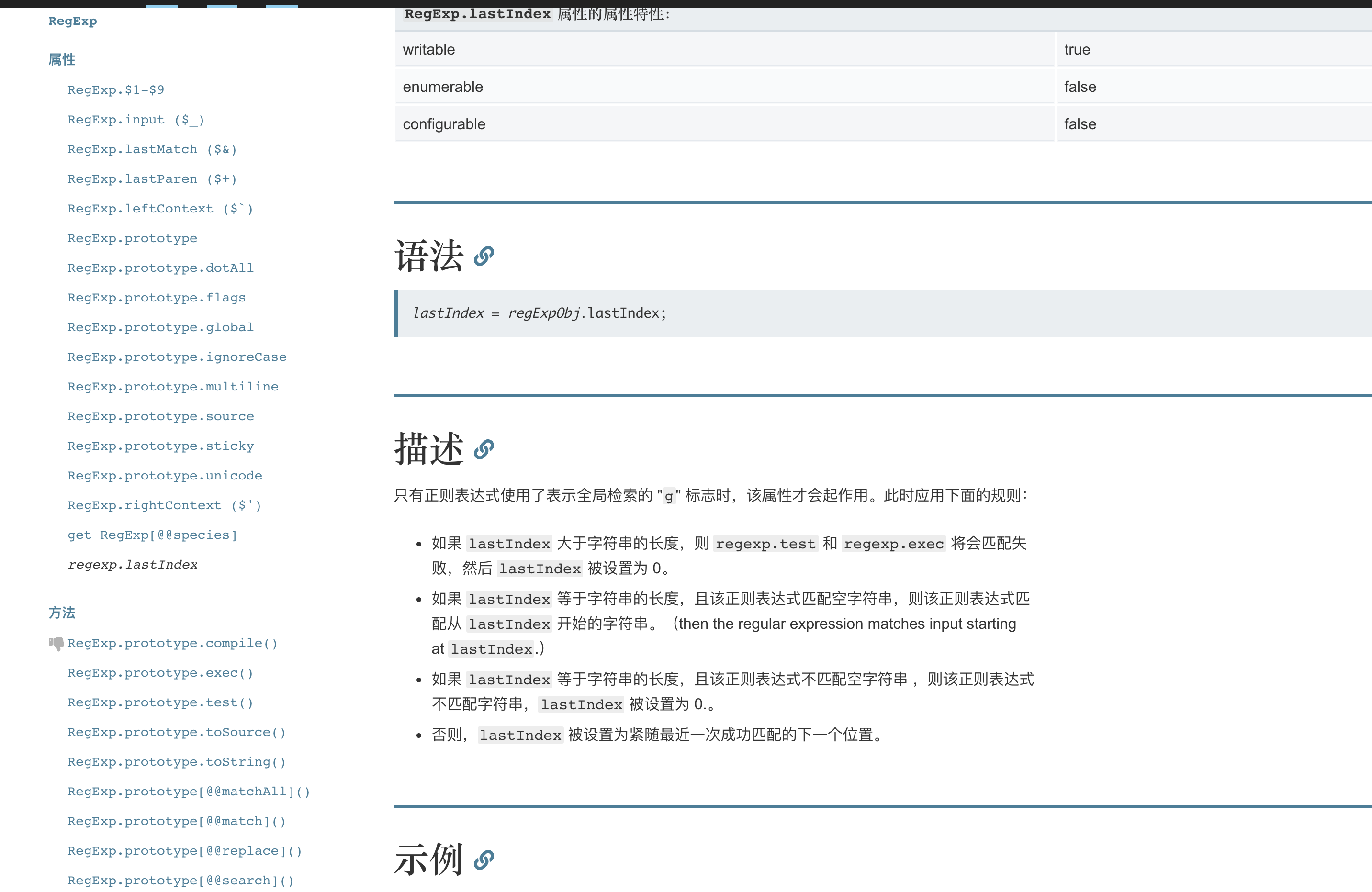 这时候一下子也不知道是什么原因了,然后去MDN上查了一下,知道了原因,在RegExp对象上面有一个属性(注意不是方法) lastIndex,下面是MDN截图
