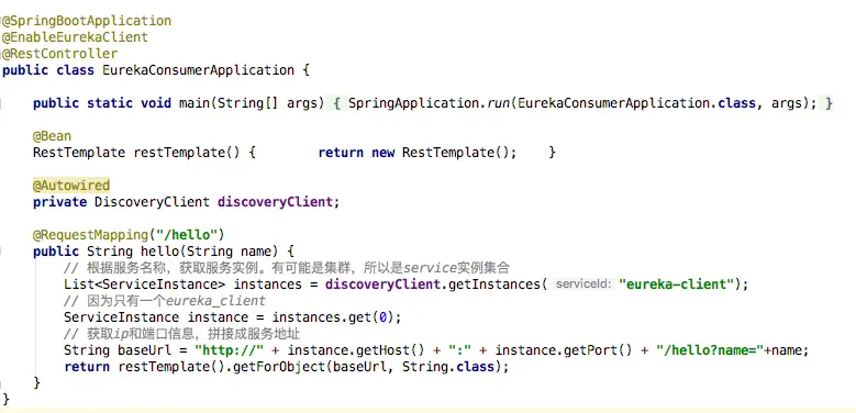 启动类加入注解 @EnableEurekaClient 并加入 Restful api 提供服务实例获取案例,这里实例后去方式采用Ribbon+RestTemplate模式,后面一章会使用Feign。
