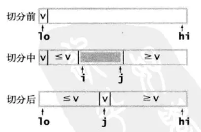 取a[lo]为切分元素v,指针i,j分别从数组的左右两端开始扫描,从左至右找到一个大于v的元素,从右至左找到一个小于v的元素,这两个元素都是未被排定的,于是交换它俩的位置,然后继续扫描、交换,直到左“指针”i和右“指针”j相遇,便完成了一次针对元素v的切分过程,同时v也已经被排定到合适的位置了。每次切分总能排定一个元素,最终便会将所有的元素排到正确的位置。 扫描时,用less(a[++i], v)而不是less(a[i++], v),因为刚进来时i被赋值为lo,lo是切分元素,要从下一位开始扫描;而右“指针”j的比较代码为less(v, a[--j]),而不是j--,是因为j初始被赋值为hi+1。 在遇到边界元素时,这段代码也可以将其排定。