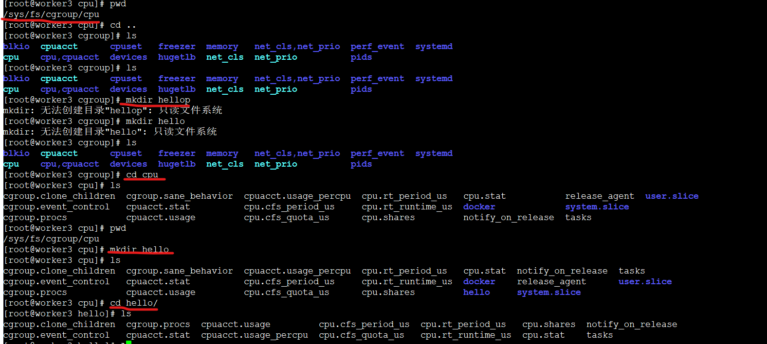 - Cgroup的资源限制是通过目录进行控制的,比如:在/sys/fs/cgroup/cpu目录下面创建hello文件夹,将会自动生成一堆默认cpu限制文件。
