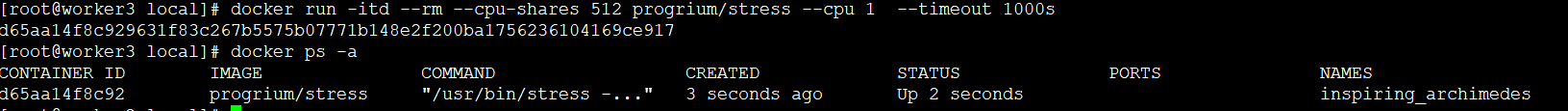 docker run -itd --rm --cpu-shares 512 progrium/stress --cpu 1 --timeout 1000s