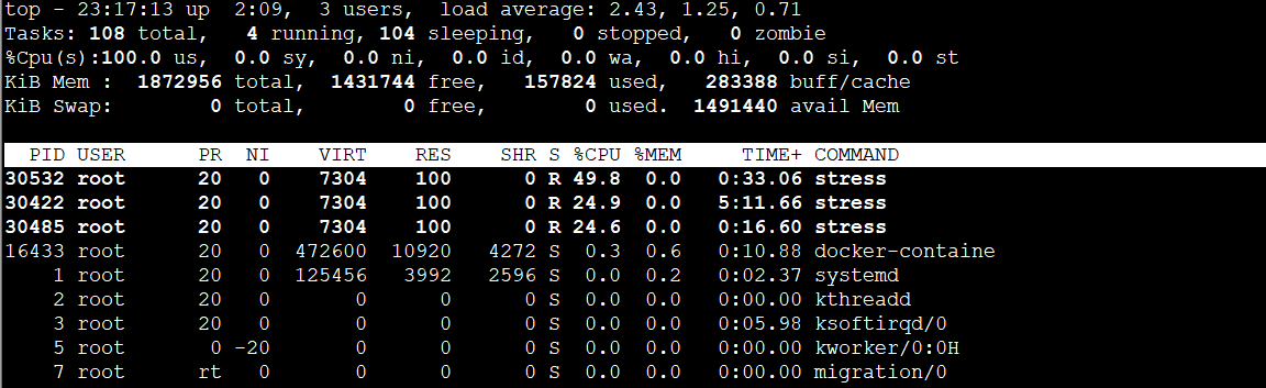 32032 root 20 0 7304 100 0 R 99.7 0.0 0:38.25 stress