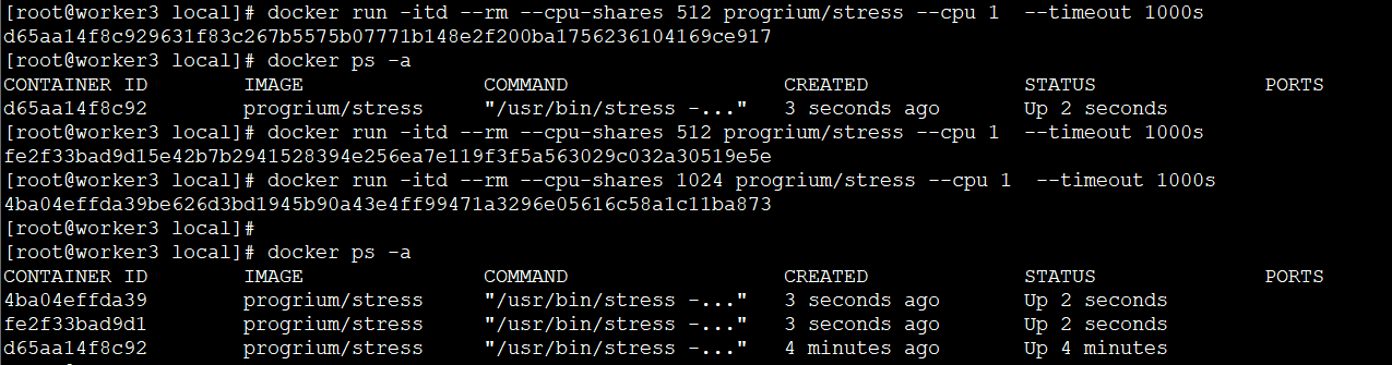 [root@worker3 local]# docker run -itd --rm progrium/stress --vm 4 --vm-bytes 256M --timeout 100s
