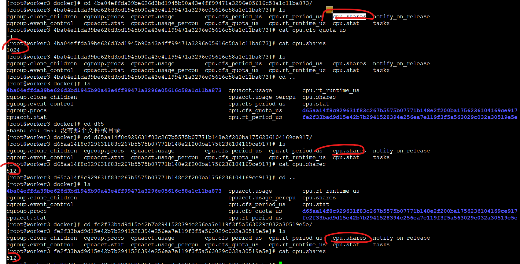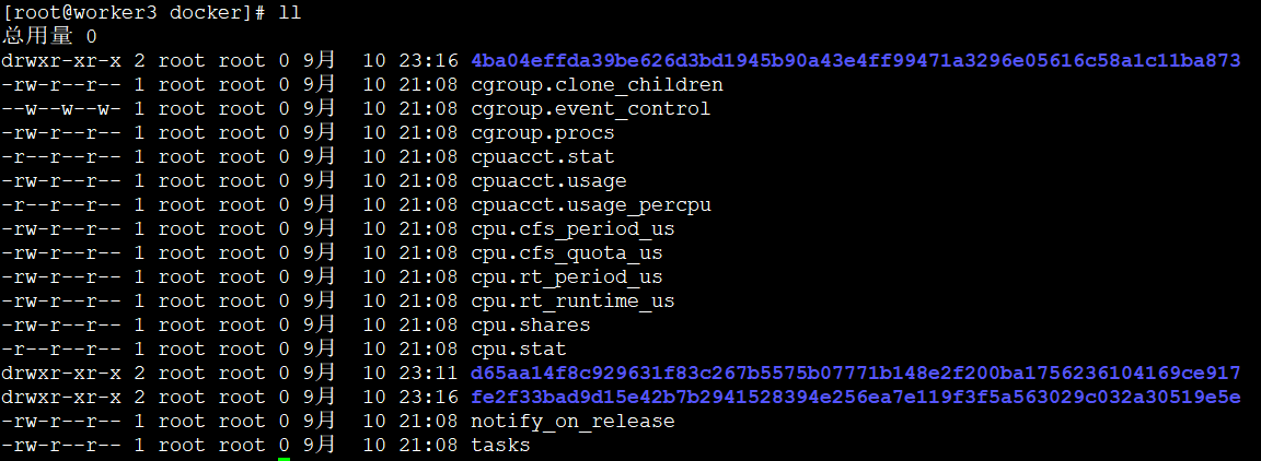 - 查看/sys/fs/cgroup/cpu/docker目录下对应三个目录,分别是:4ba04effda39be626d3bd1945b90a43e4ff99471a3296e05616c58a1c11ba873,d65aa14f8c929631f83c267b5575b07771b148e2f200ba1756236104169ce917,fe2f33bad9d15e42b7b2941528394e256ea7e119f3f5a563029c032a30519e5e