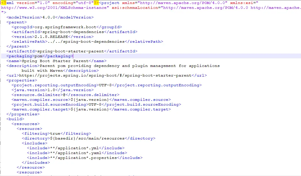 当我们创建一个 Spring Boot 项目后,我们可以在本地 Maven 仓库中看到看到这个具体的 parent 文件,以 2.1.8 这个版本为例,松哥 这里的路径是 C:\Users\sang\.m2\repository\org\springframework\boot\spring-boot-starter-parent\2.1.8.RELEASE\spring-boot-starter-parent-2.1.8.RELEASE.pom ,打开这个文件,快速阅读文件源码,基本上就可以证实我们前面说的功能,如下图: