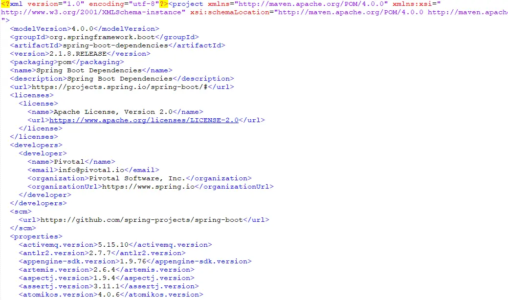 我们可以看到,它继承自 spring-boot-dependencies ,这里保存了基本的依赖信息,另外我们也可以看到项目的编码格式,JDK 的版本等信息,当然也有我们前面提到的数据过滤信息。最后,我们再根据它的 parent 中指定的 spring-boot-dependencies 位置,来看看 spring-boot-dependencies 中的定义: