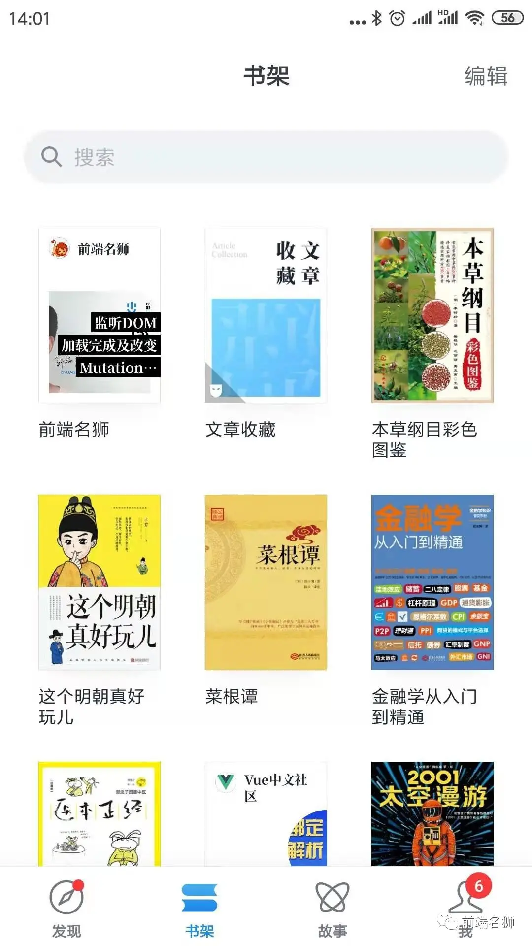 5. 点击右上角添加到书架的图标,可以将【前端名狮】的公众号当做一本书放到书架上,可以随时阅读,并且能够接收到公众号文章更新的提醒,如下图所示: