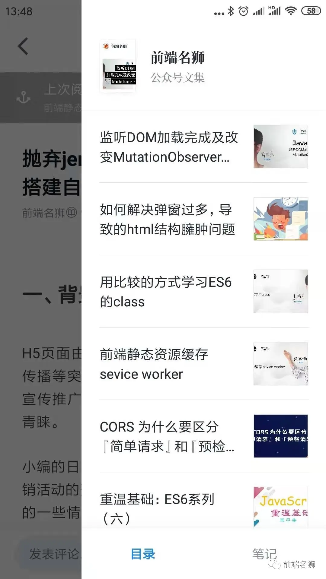4. 点击微信读书右上角的目录图标,可以看到当前【前端名狮】公众号上发布的所有文章的目录和笔记。