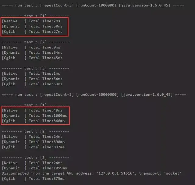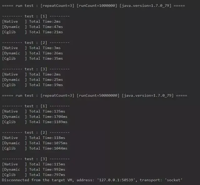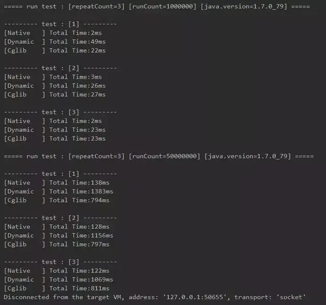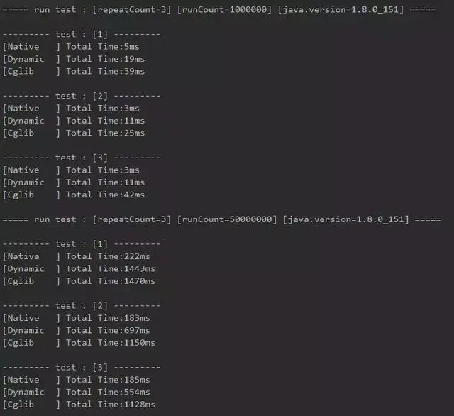 经过多次试验,可以看出平均情况下的话,JDK动态代理的运行速度已经逐渐提高了,在低版本的时候,运行的性能可能不如CGLib,但是在1.8版本中运行多次,基本都可以得到一致的测试结果,那就是JDK动态代理已经比CGLib动态代理快了!