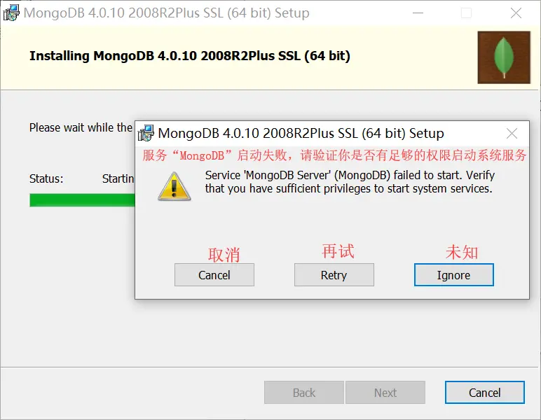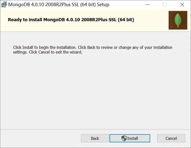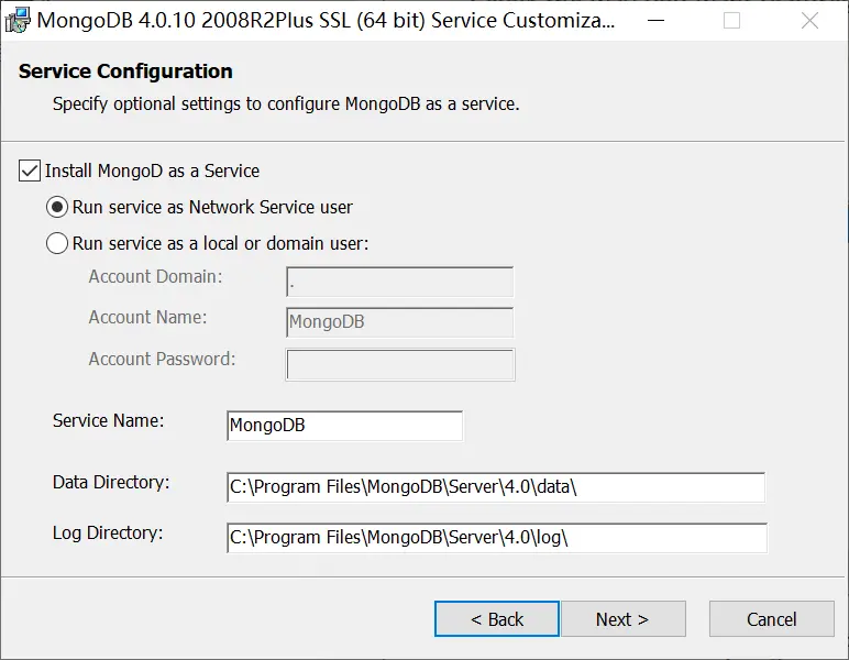 # 安装mongod --dbpath "D:\Program Files\MongoDB\Server\4.0\data" --logpath "D:\Program Files\MongoDB\Server\4.0\log\mongod.log" --install --serviceName "MongoDB"