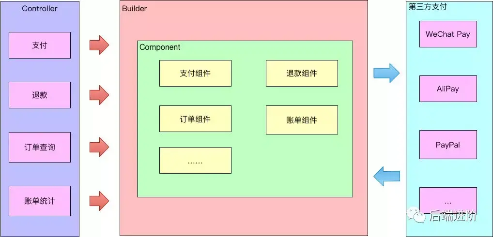 通过 Builder 模式根据请求参数构建对应的组件对象,将组件与外部分离,隐藏组件构建的实现。组件模式 + Builder 模式使得支付平台具备了高扩展性。